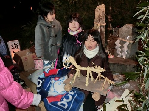 ◎とっこ館西側の山田地域で道祖神祭が行われております。地元伝承行事で道路脇の道祖神様を囲い、子供たちがお参りの大人の人たちにお札を配ったり、お菓子や甘茶などをふるまっています。山田地域は二か所の道祖神を毎年交代で祭祀をしております。今年は地域の西側の道祖神で行われました。伺った時は、大人や子供わ含めて40人ほどの地域の方々がおられました。その様子を掲載いたします。子供たちはほっぺを赤くして、飛び回っていました。