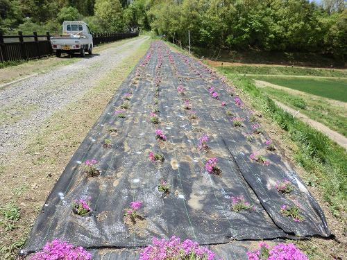 これで平成18年から続いた池のえん堤への景観形成のためのシバザクラの植栽は完了しました。総延長800mになります。各年度ごとに植栽の手法・肥料を変化させ比較検討ができるようになっています。